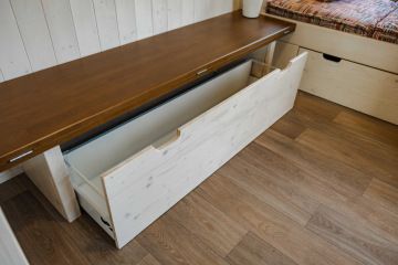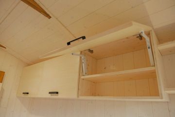 Korpusy nábytku jsou ve standardu ze smrkové biodesky, dvířka z dýhované předkližky (u dvířek dosauje větší tvarové stálosti než biodeska). Pracovní desky a nášlapové plochy jsou pak z tvrdé bukové spárvky, kterou lze nahradit jasanovou spárovkou (obě dřeviny dosahují srovnatelných kvalit a jde tedy pouze o to co upřednostníte z vizuelního hlediska). Je třeba počítat s tím, že dřevo na pracovní desce vyžaduje údržbu a šetrné zacházení, v případě, že chcete povrch, který bude bezúdržbový doporučujeme zvolit laminátovou DTD desku.
