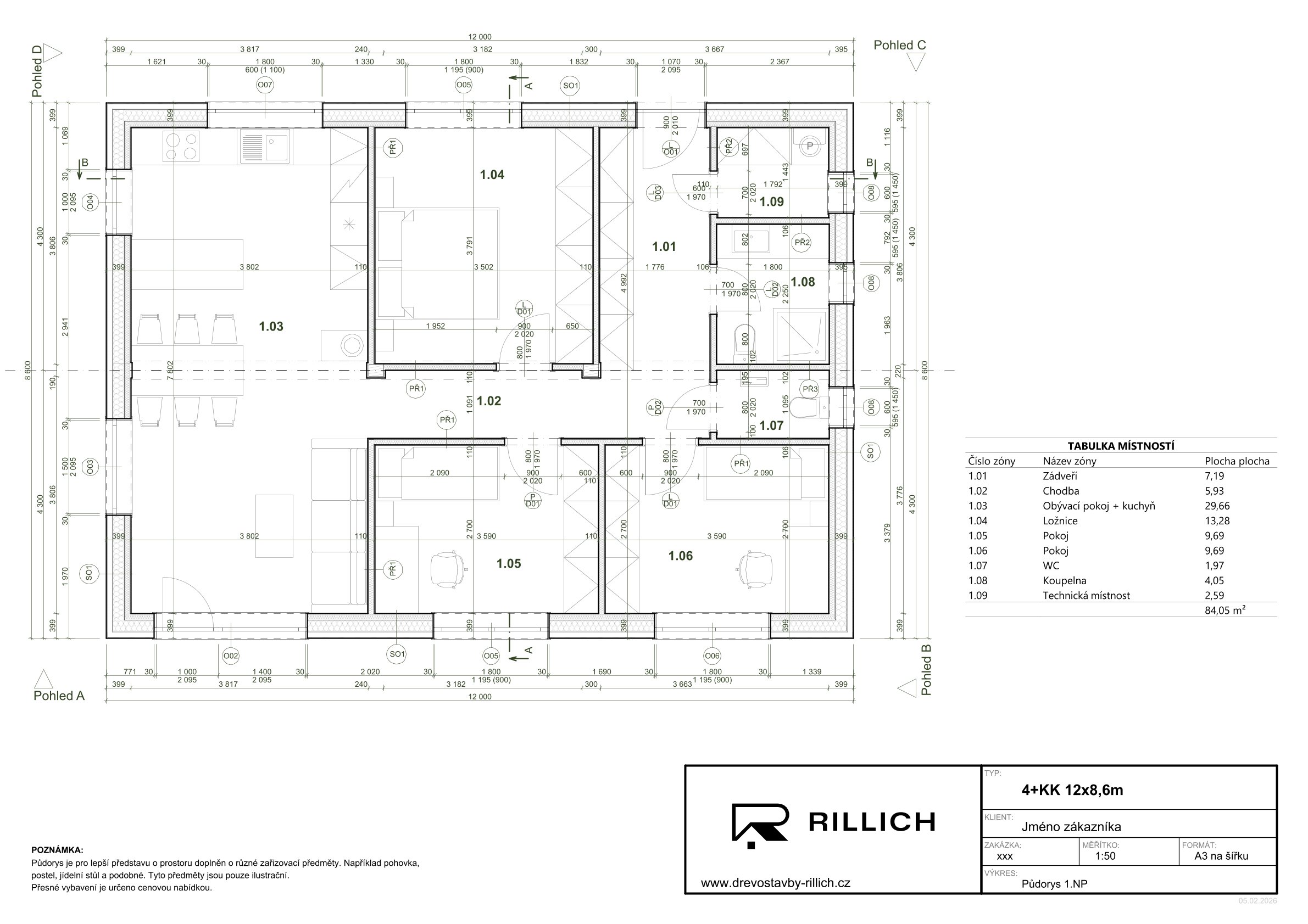 Navazuje dřevěná rámová konstrukce o síle 200mm, která je vyplněná izolací ISOVER UNI.