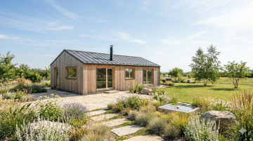 Exteriér dřevostavby je jednoduchý, s důrazem na udržitelné materiály a minimální dopad na okolní prostředí. Tato dřevostavba je ideální pro ty, kteří hledají únik od každodenního shonu a chtějí pohodlné a funkční bydlení.