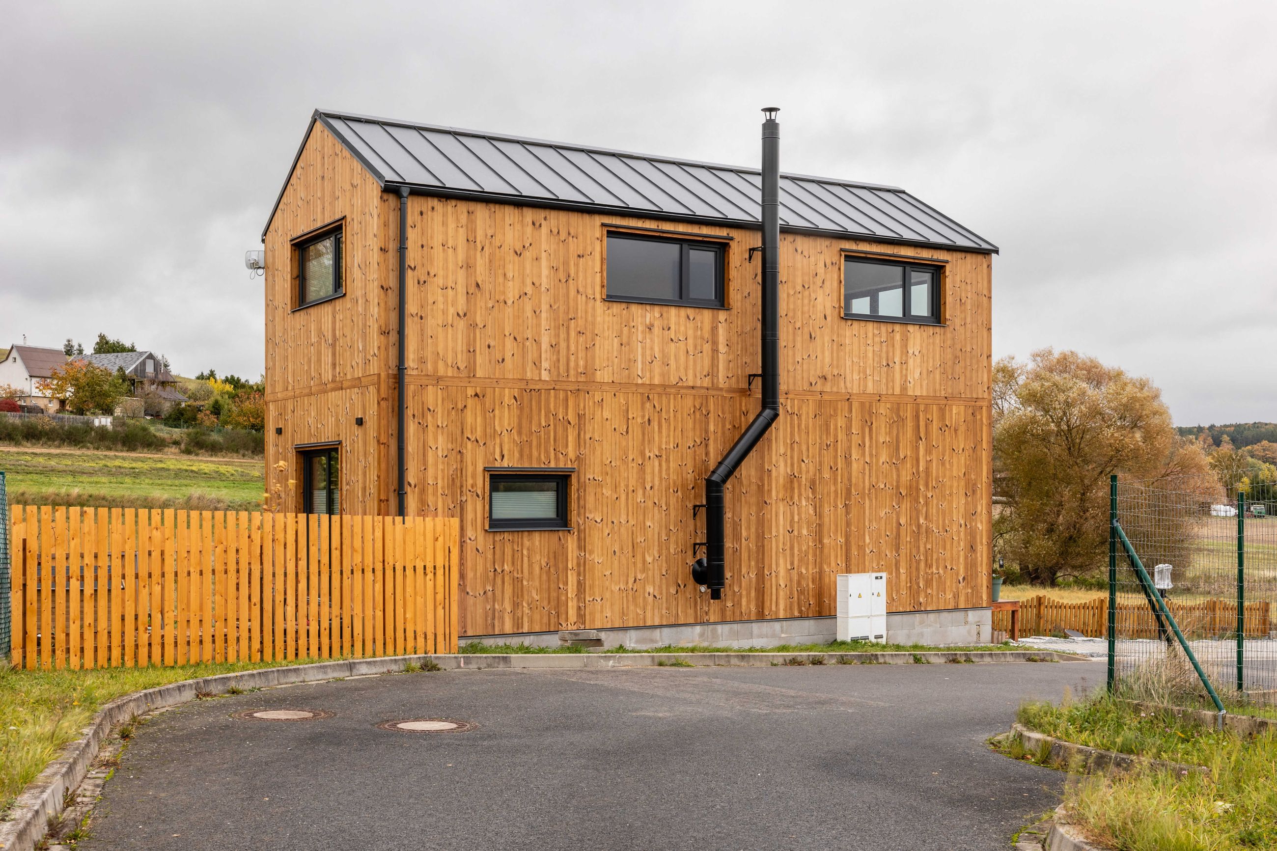 Dvoupatrová modulová dřevostavba navržená pro komfortní trvalé bydlení v kontaktu s přírodou.