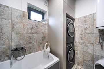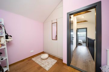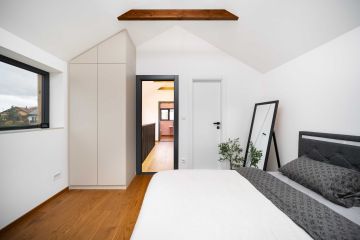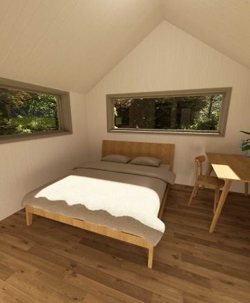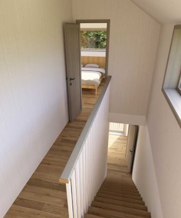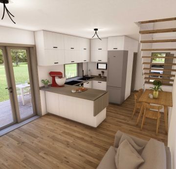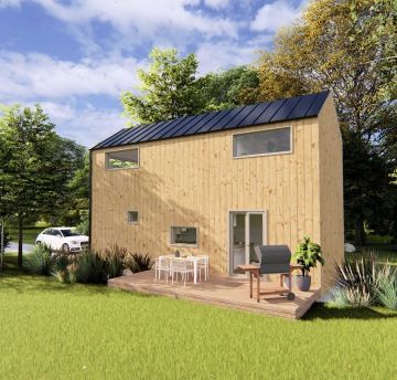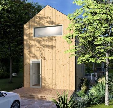 Tato dřevostavba kombinuje dva moduly vytvářející efektivní využití prostoru. V přízemí najdete otevřený obytný prostor s kuchyní a obývacím pokojem, který se rozprostírá na venkovní terasu nebo zahradu. Dále koupelnu, zádveří a WC. Zatímco v horním patře se nachází soukromá ložnice, dětský pokoj a prostorná šatna.