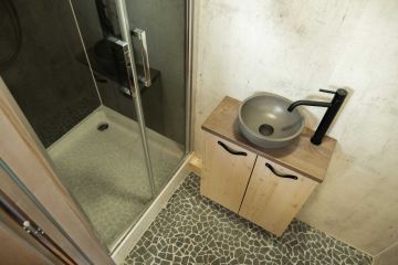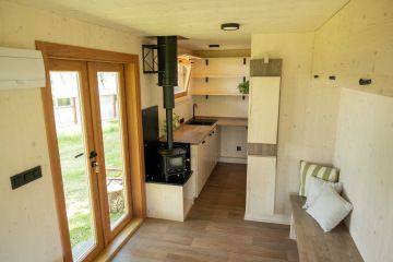 Interiér Kostky je navržen tak, aby maximálně využil dostupný prostor, přičemž klade důraz na krásu a kvalitu přírodních materiálů. Díky krásné kuchyni s plně vybavenou koupelnou máte vše co potřebujete.