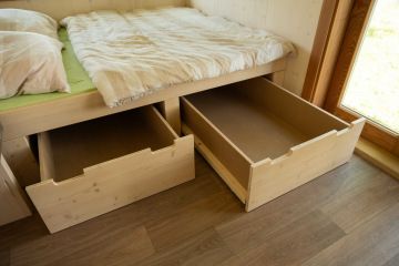 Korpusy nábytku jsou ve standardu ze smrkové biodesky, dvířka z dýhované předkližky (u dvířek dosauje větší tvarové stálosti než biodeska). Pracovní desky a nášlapové plochy jsou pak z tvrdé bukové spárvky, kterou lze nahradit jasanovou spárovkou (obě dřeviny dosahují srovnatelných kvalit a jde tedy pouze o to co upřednostníte z vizuelního hlediska). Je třeba počítat s tím, že dřevo na pracovní desce vyžaduje údržbu a šetrné zacházení, v případě, že chcete povrch, který bude bezúdržbový doporučujeme zvolit laminátovou DTD desku.