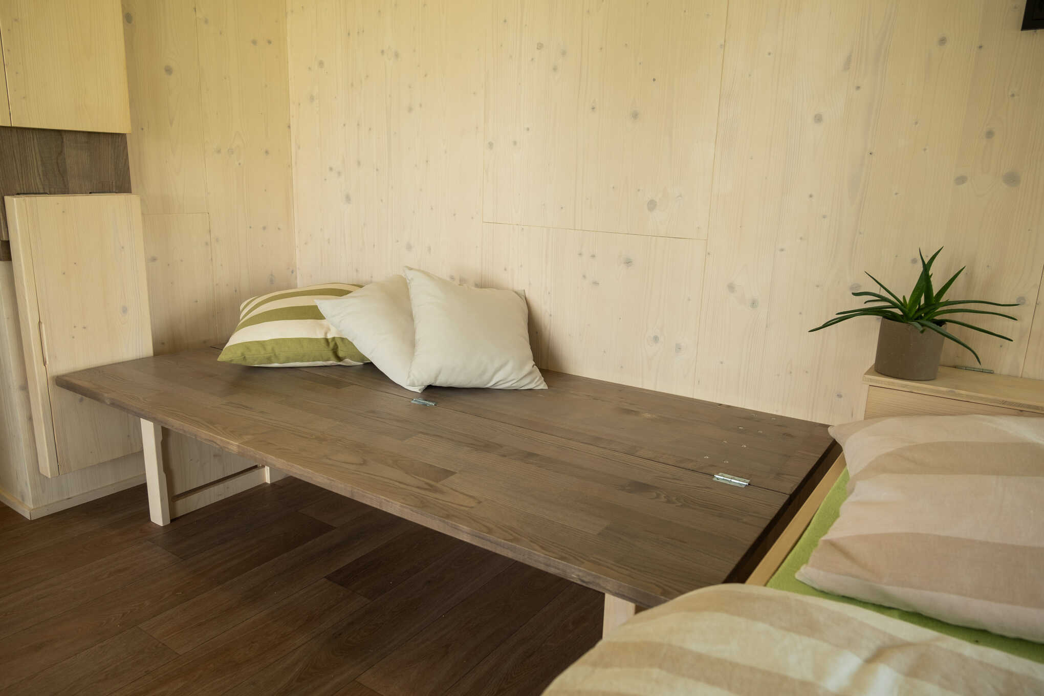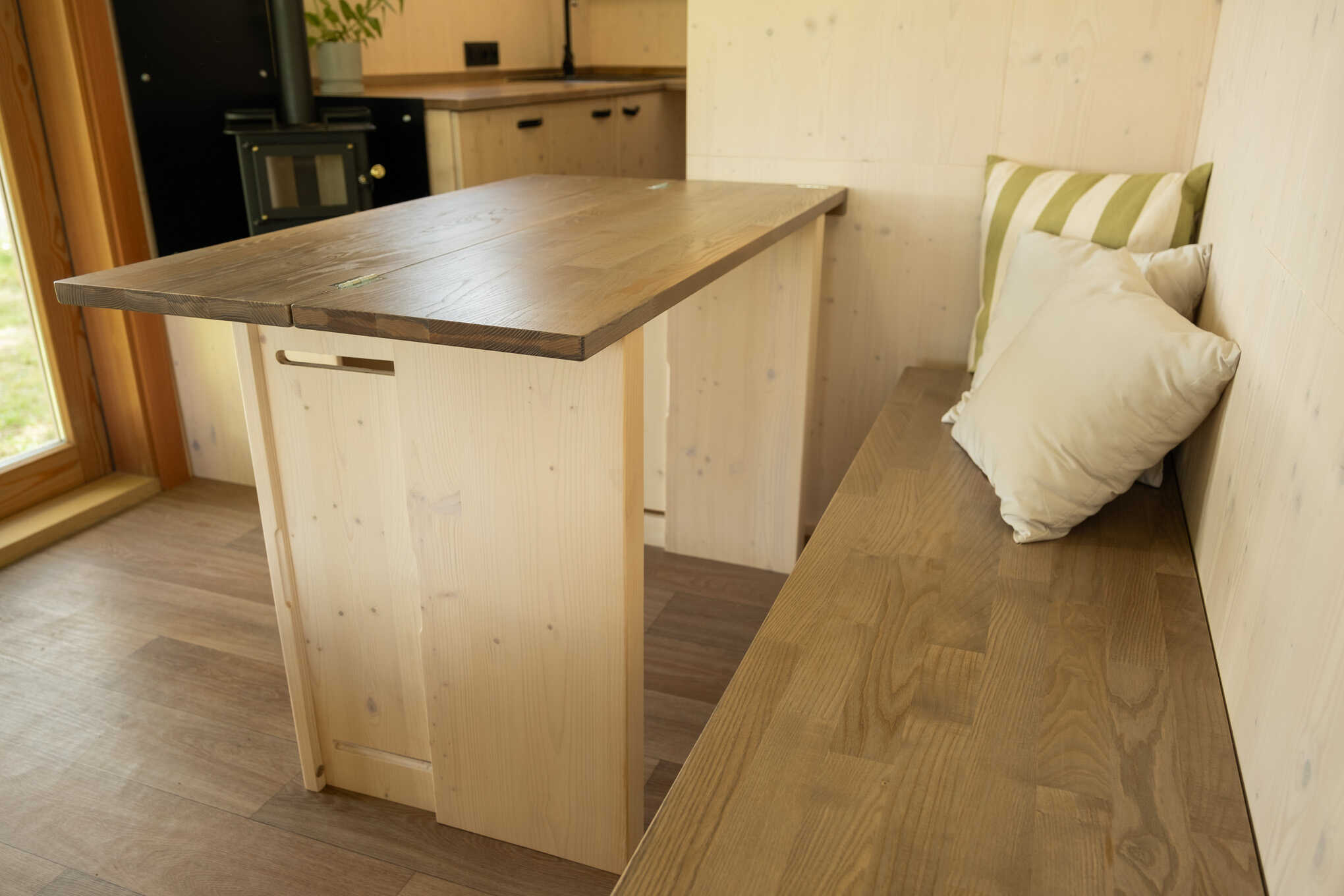 Korpusy nábytku jsou ve standardu ze smrkové biodesky, dvířka z dýhované předkližky (u dvířek dosauje větší tvarové stálosti než biodeska). Pracovní desky a nášlapové plochy jsou pak z tvrdé bukové spárvky, kterou lze nahradit jasanovou spárovkou (obě dřeviny dosahují srovnatelných kvalit a jde tedy pouze o to co upřednostníte z vizuelního hlediska). Je třeba počítat s tím, že dřevo na pracovní desce vyžaduje údržbu a šetrné zacházení, v případě, že chcete povrch, který bude bezúdržbový doporučujeme zvolit laminátovou DTD desku.