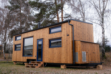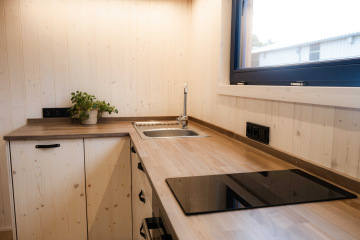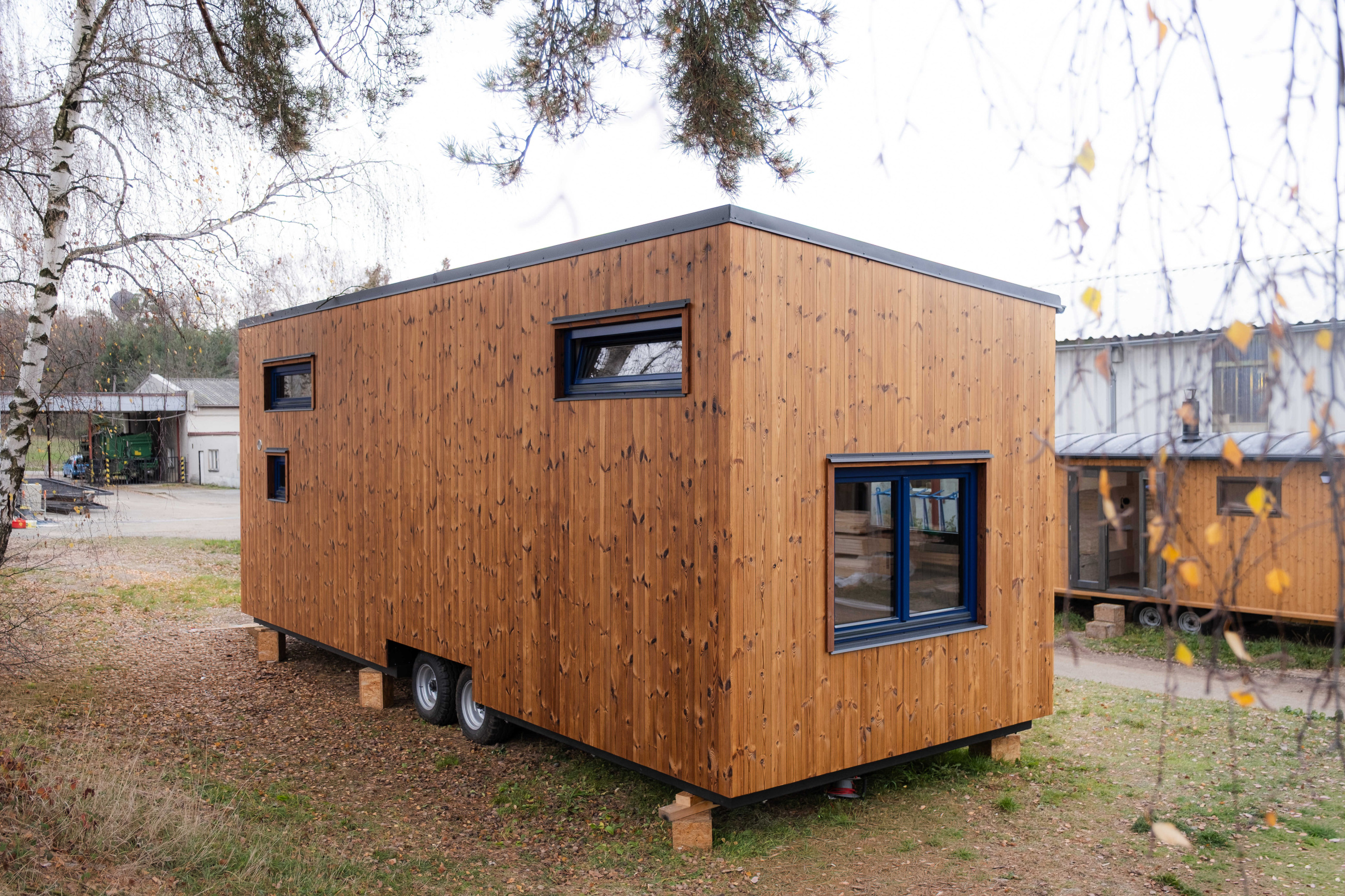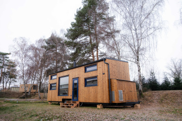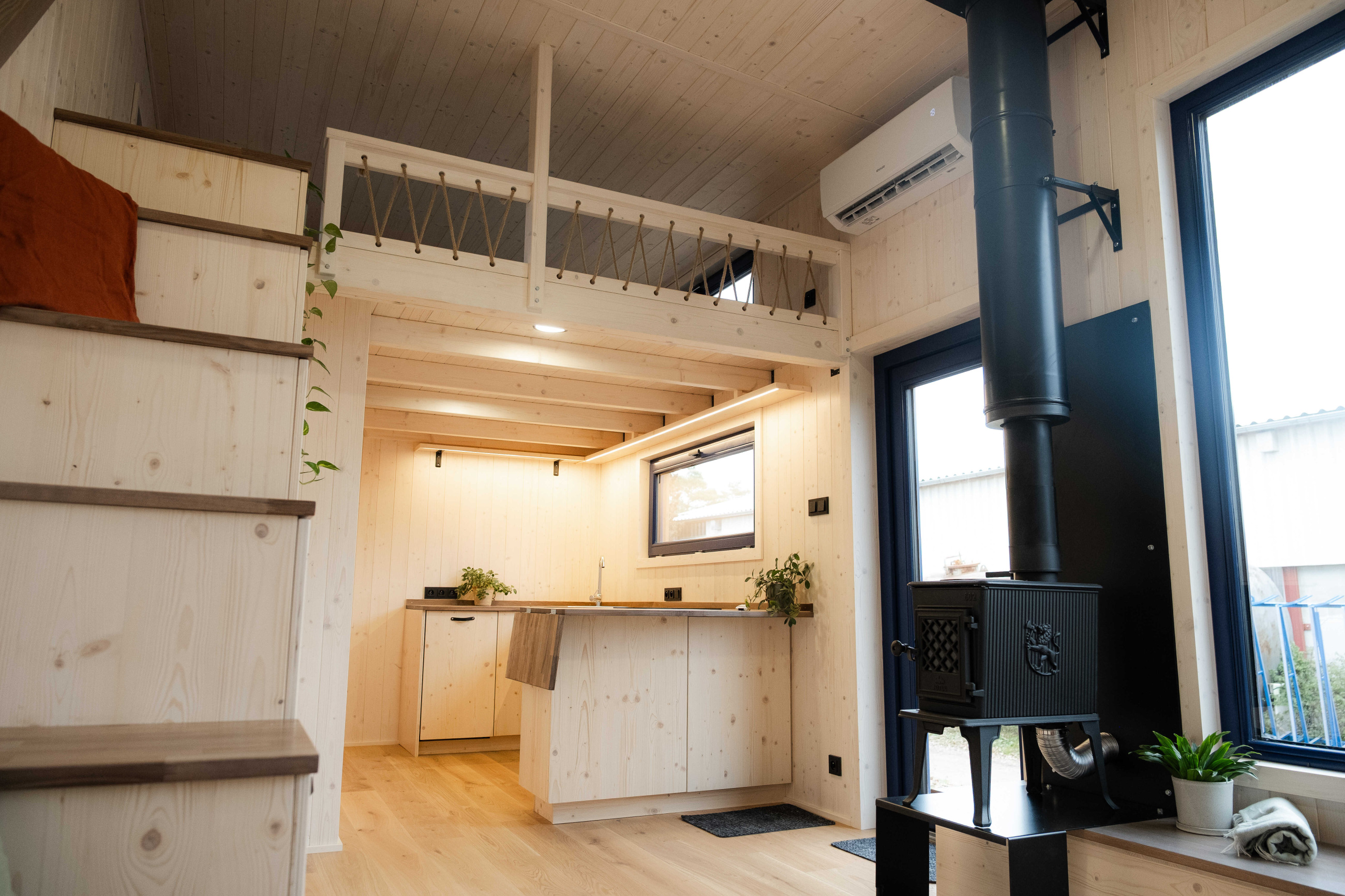 Tiny house Pulťák 9 m je prostorný dům na kolech s pultovou střechou a velkým obytným prostorem orientovaným do výhledu. Tahle Skladovka je kompletně připravená k celoročnímu bydlení – s plnohodnotnou kuchyní, koupelnou, loftem přístupným přes schodoskříň, vytápěním tepelným čerpadlem doplněným kamny a nábytkem z naší truhlárny. Dům je hotový a po domluvě připravený k rychlému předání, dopravě a usazení na váš pozemek nebo do glampingového areálu.