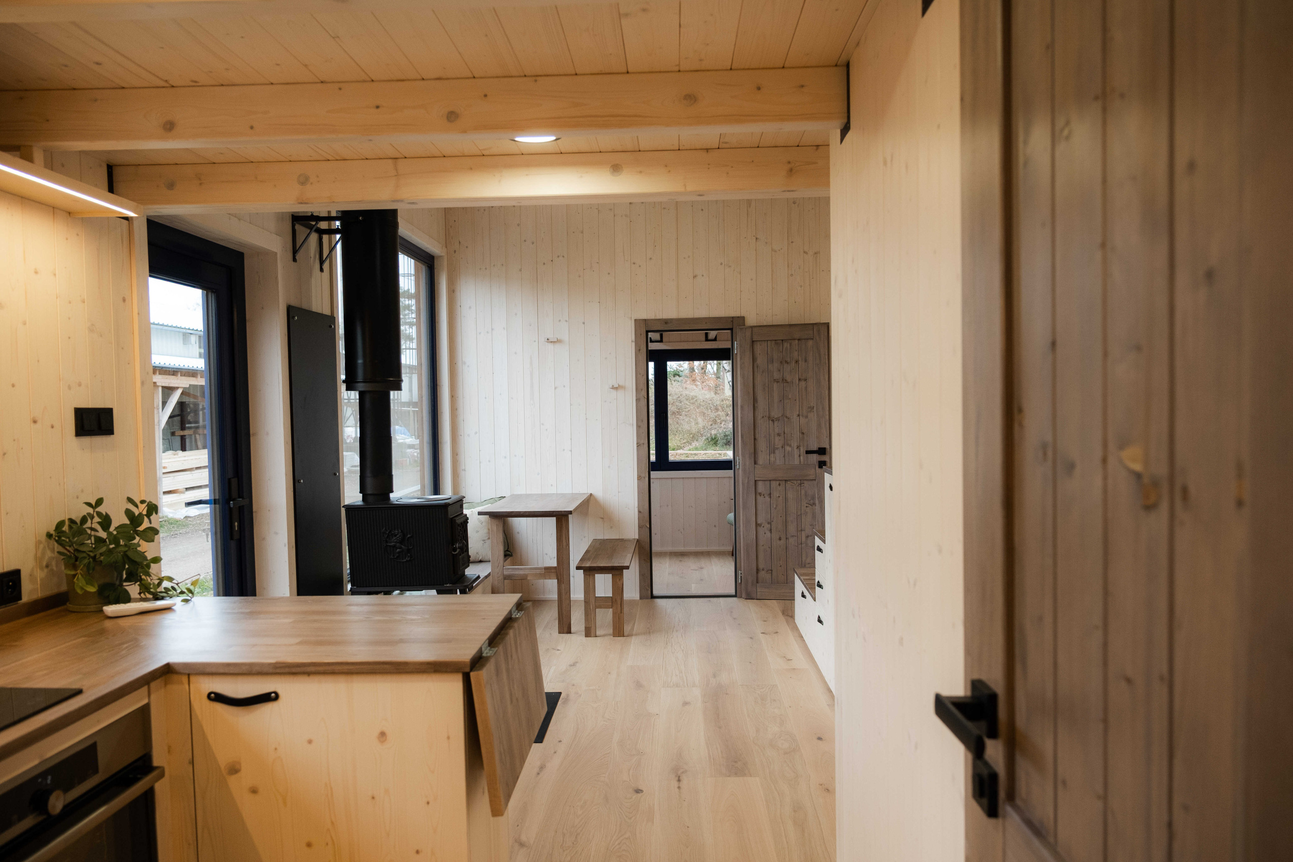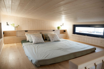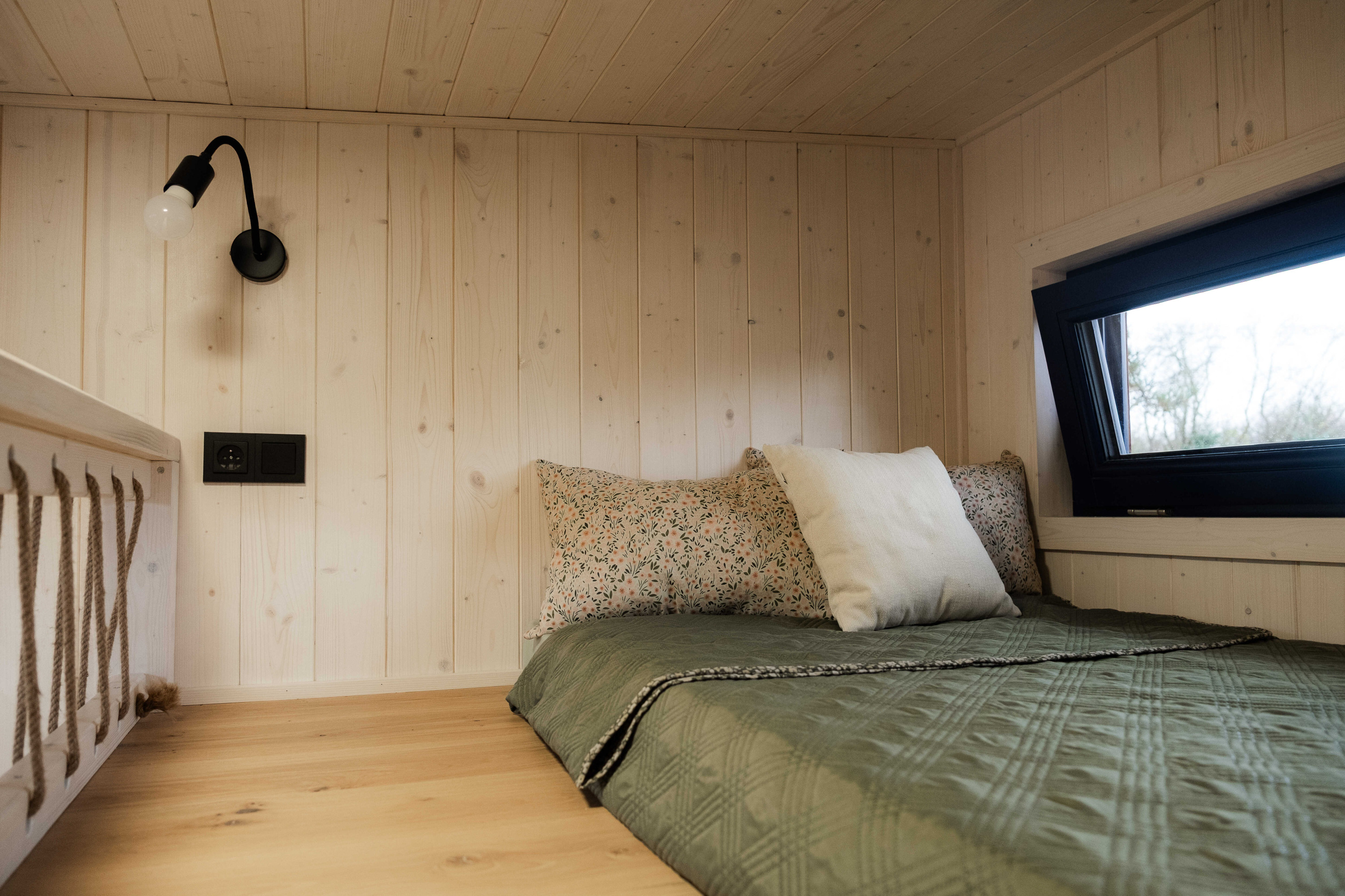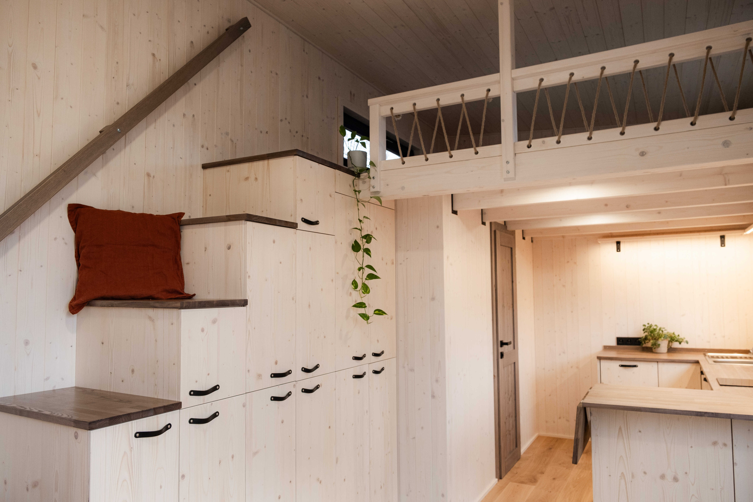 Tiny house Pulťák 9 m je prostorný dům na kolech s pultovou střechou a velkým obytným prostorem orientovaným do výhledu. Tahle Skladovka je kompletně připravená k celoročnímu bydlení – s plnohodnotnou kuchyní, koupelnou, loftem přístupným přes schodoskříň, vytápěním tepelným čerpadlem doplněným kamny a nábytkem z naší truhlárny. Dům je hotový a po domluvě připravený k rychlému předání, dopravě a usazení na váš pozemek nebo do glampingového areálu.