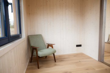 Od vnitřní strany je interiérový obklad ze smrkových palubek 15mm (lze nahradit smrkovou biodeskou).