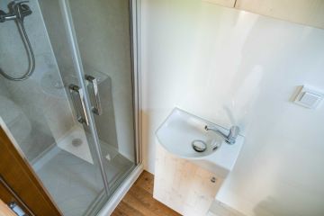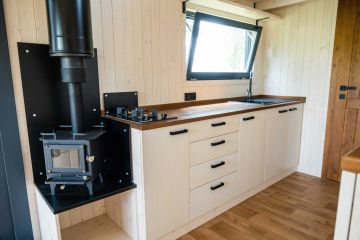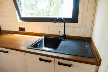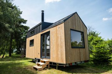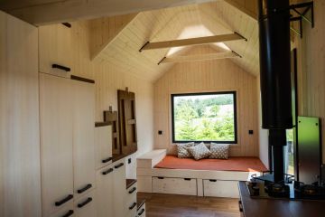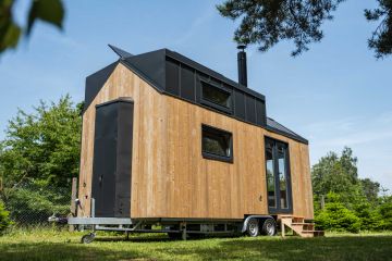 Tiny house schopný provozu po silnici, kompletně homologovaný, s vlastní SPZ. Soběstačný a schopný celoročního provozu.