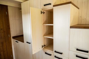 Korpusy nábytku jsou ve standardu ze smrkové biodesky, dvířka z dýhované předkližky (u dvířek dosauje větší tvarové stálosti než biodeska). Pracovní desky a nášlapové plochy jsou pak z tvrdé bukové spárvky, kterou lze nahradit jasanovou spárovkou (obě dřeviny dosahují srovnatelných kvalit a jde tedy pouze o to co upřednostníte z vizuelního hlediska). Je třeba počítat s tím, že dřevo na pracovní desce vyžaduje údržbu a šetrné zacházení, v případě, že chcete povrch, který bude bezúdržbový doporučujeme zvolit laminátovou DTD desku.